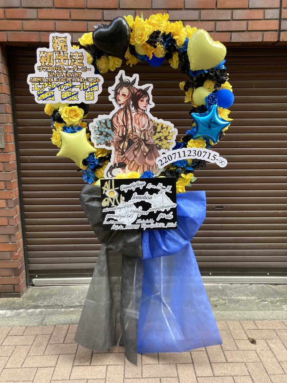 「ウマ娘」の世界観を表現した、黄・青・黒で彩られたフラスタ。キャラクターパネルを中心に、華やかな生花とバルーンで祝祭感を演出。