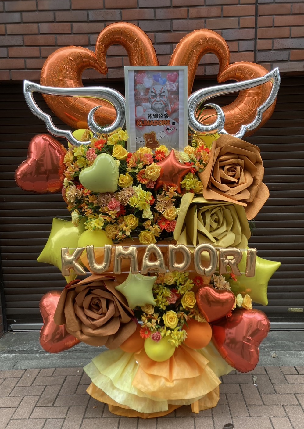 O-MENZ公演を祝う、KUMADORIがテーマの豪華フラスタ。オレンジや黄色の暖色系バルーンと生花が、華やかで力強い世界観を表現しています。