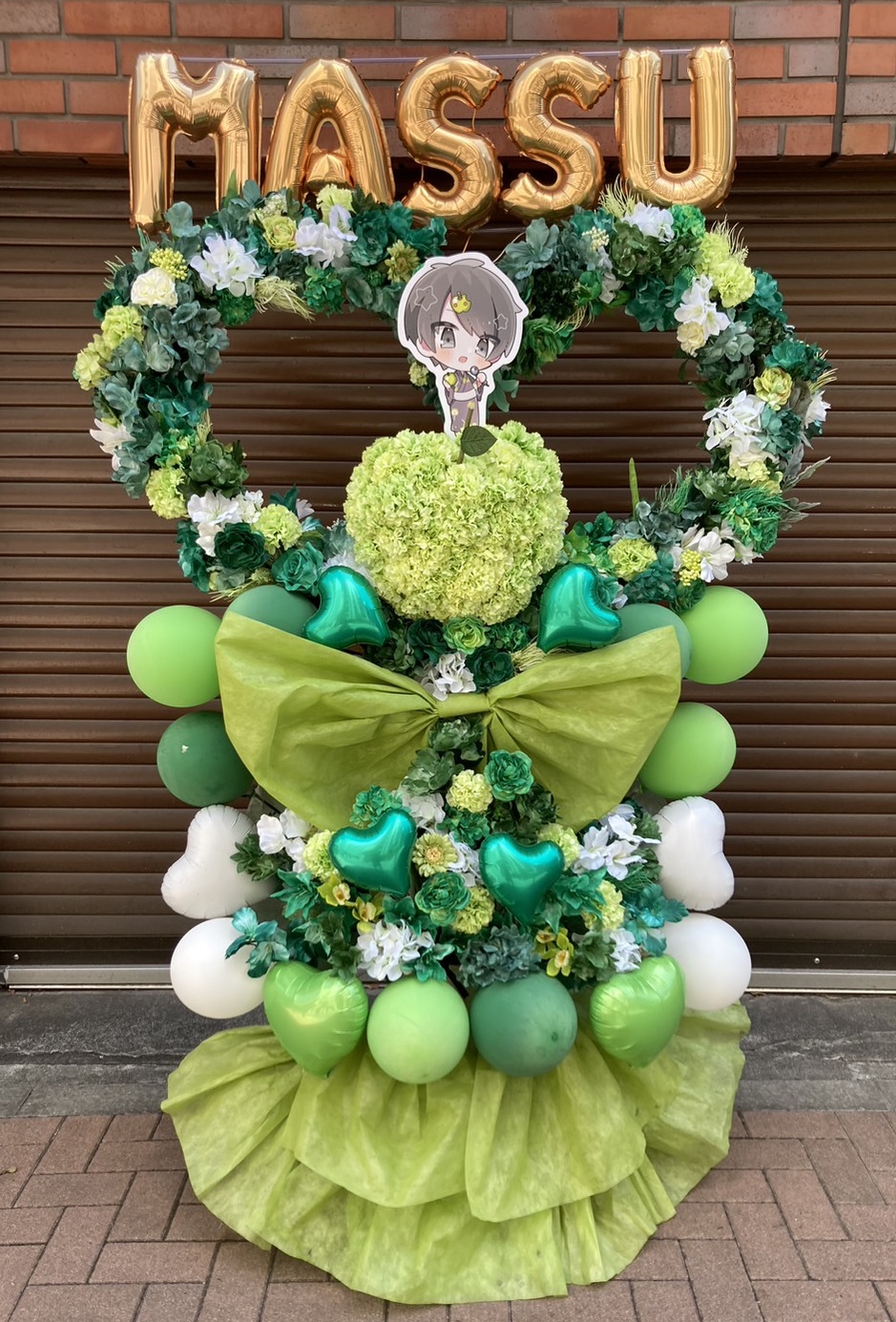 爽やかなグリーンを基調に、白い花やバルーンで華やかさをプラス。キャラクターパネルとゴールドの文字が目を引く、賑やかなフラスタです。