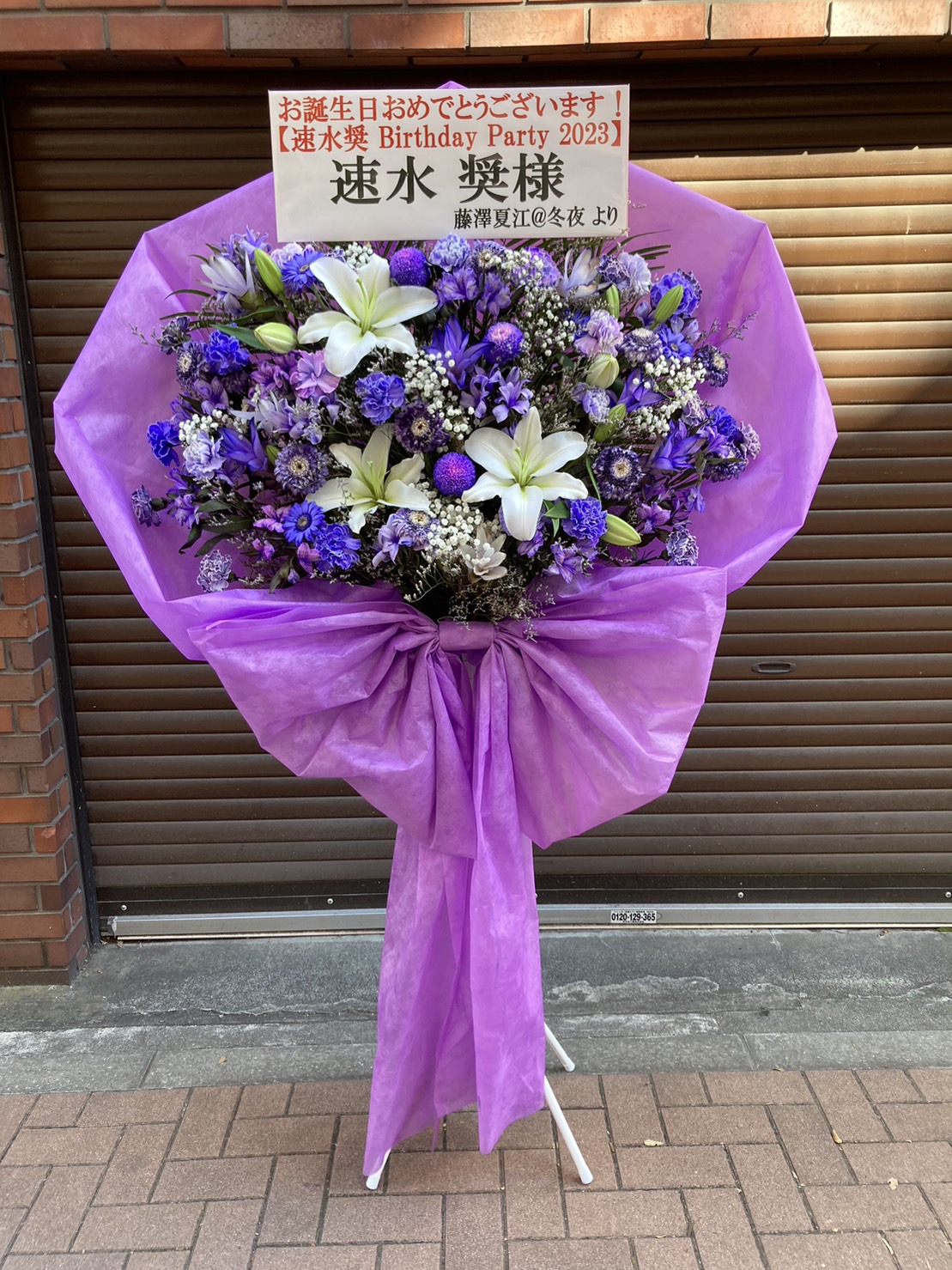 速水奨さんお誕生日イベントへのお祝いフラスタ。パープルとブルーの生花が織りなすエレガントなスタンドです。白いユリが上品さを添えています。