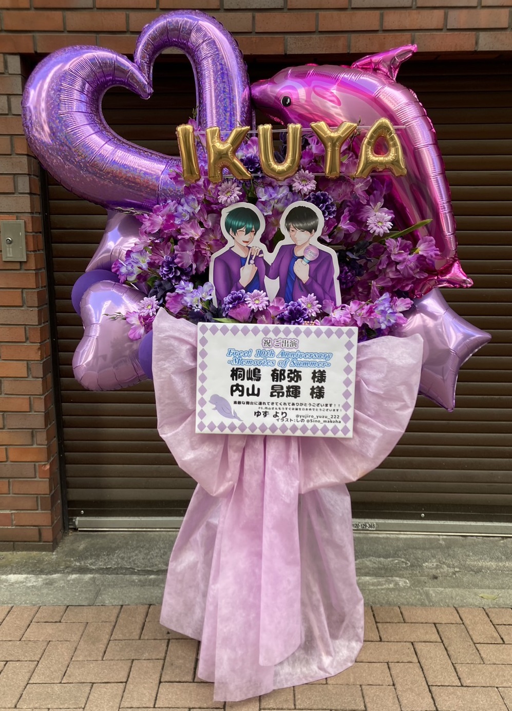 Free! 10周年を祝う、紫とパステルカラーで彩られた華やかなフラスタ。ハートやイルカのバルーン、キャラクターパネルが目を引きます。