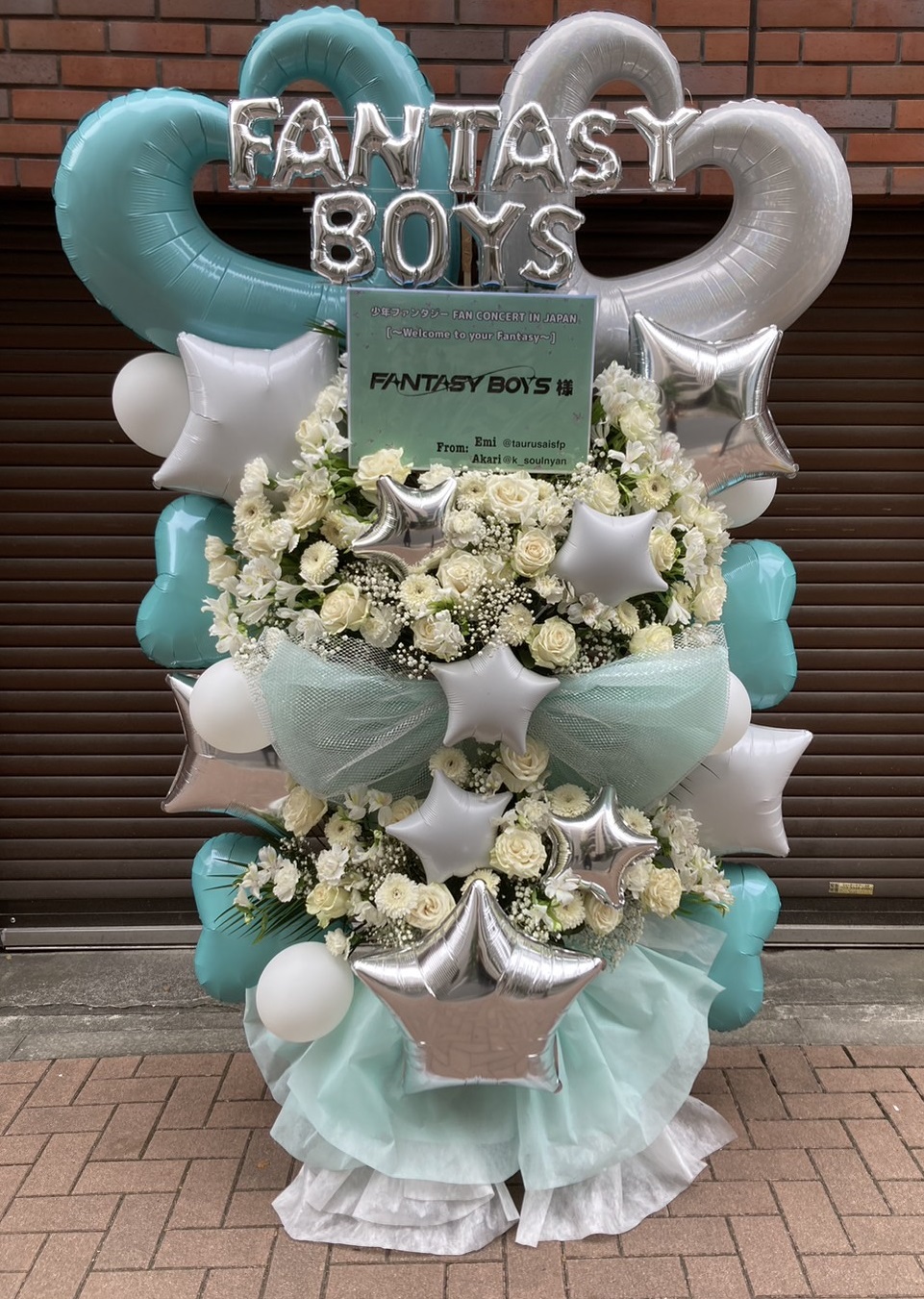 FANTASY BOYSさんのファンコンサートへ贈られた、パステルブルーと白を基調とした爽やかなフラスタ。星形バルーンと生花が織りなすファンタジーな雰囲気が魅力です。
