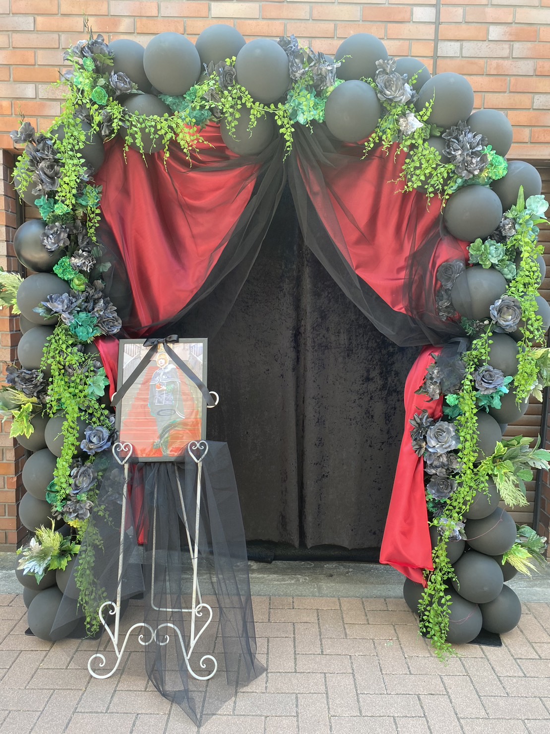 黒と赤を基調に、緑のツタとダークな花が絡みつくゴシックなフラスタ。荘厳でミステリアスな雰囲気を演出。