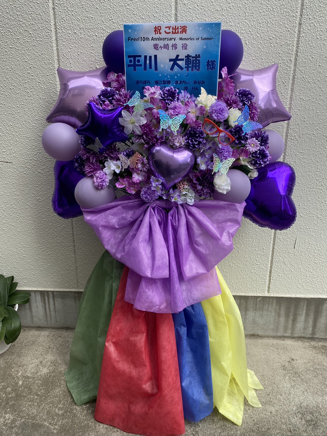 Free! 10周年イベントを祝うフラスタ。メインの紫と青を基調に、パステルカラーの花や蝶、バルーンが華やか。下部のカラフルな装飾もポイント。