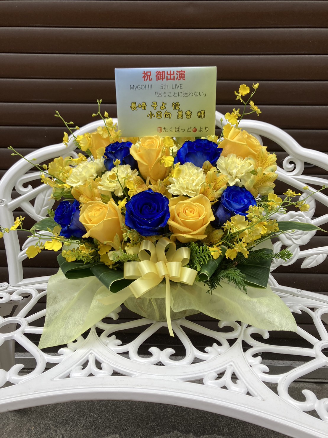 鮮やかな青と黄色の花々が織りなす、爽やかで力強いスタンド花。MyGO!!!!! 5th LIVEの小日向美香さんへ贈られました。