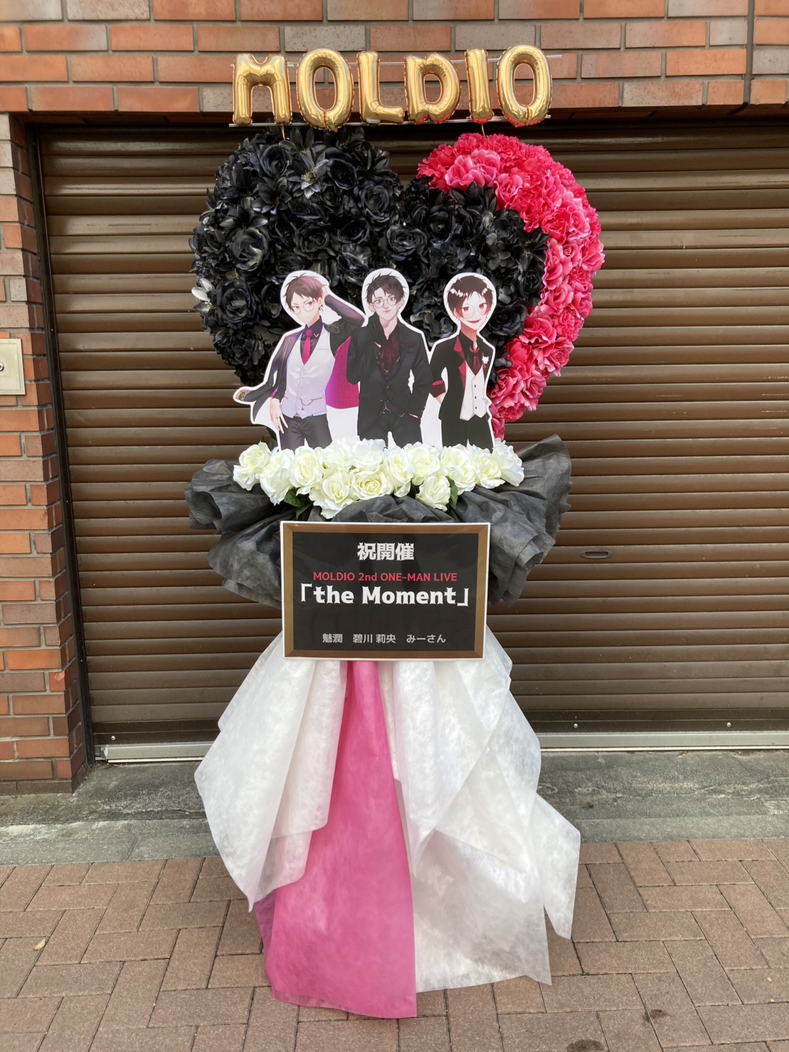 MOLDIO 2nd ONE-MAN LIVE開催を祝うフラスタ。黒とピンクのハートアレンジが情熱的で、キャラクターパネルとバルーンでクール&スタイリッシュな雰囲気を演出。