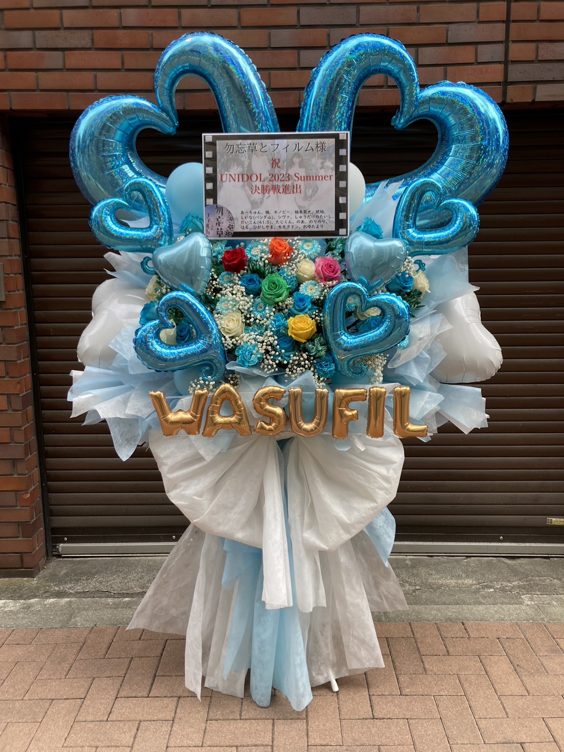 UNIDOL Summerを彩る、爽やかなブルーとホワイトが基調のフラスタ。カラフルな生花とハートバルーンが華やかさを添えています。