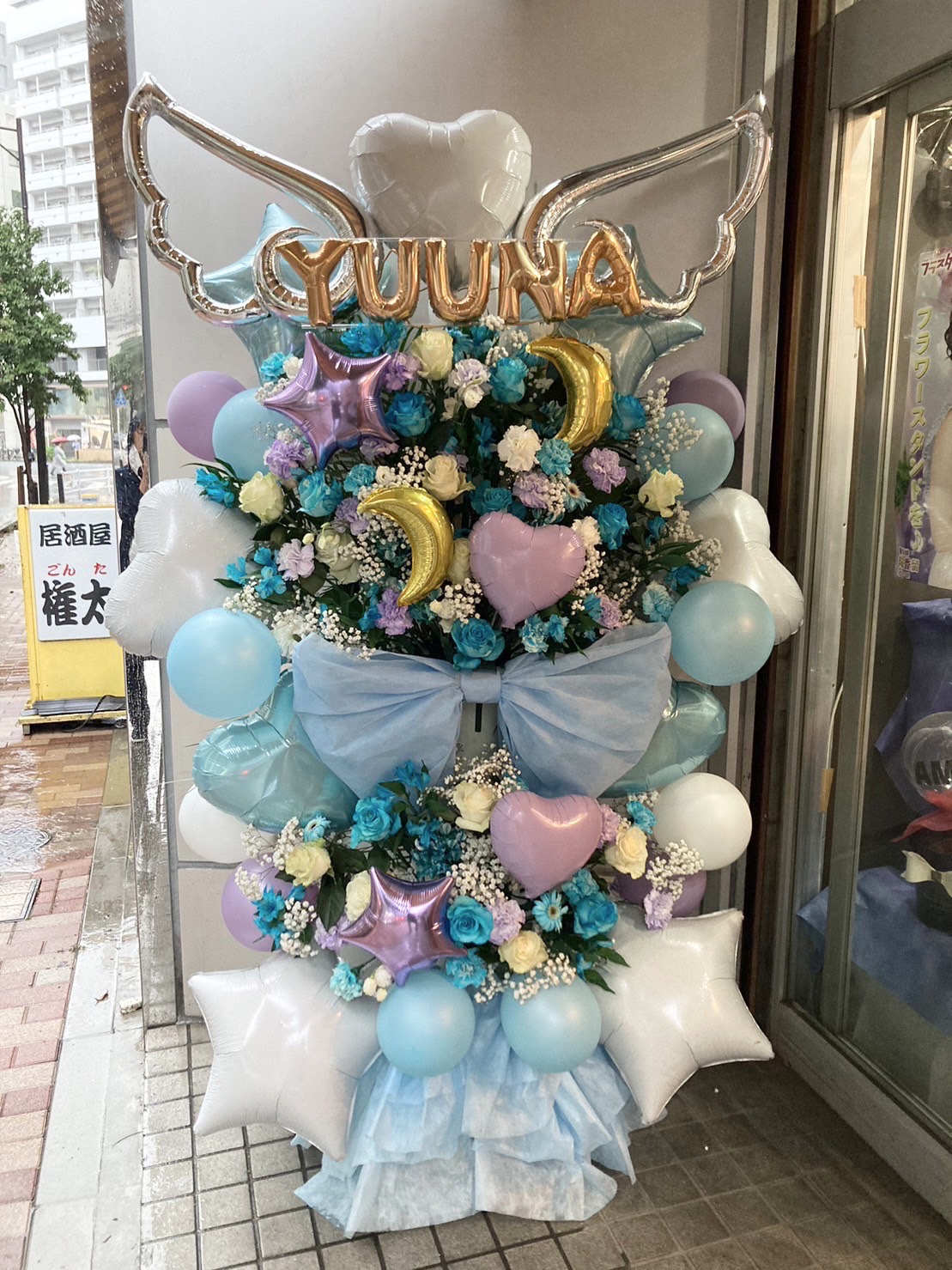 苗加結菜生誕祭をお祝いする、パステルカラーが可愛らしいフラスタ。水色や薄紫の生花とバルーンで、夢のような華やかな雰囲気を演出しました。