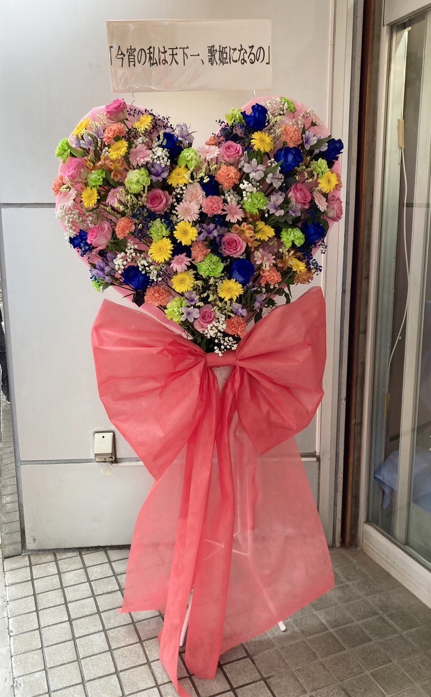 虹みみゆさんの1stワンマンをお祝いする、パステルカラーが煌めくハート型フラスタ。大きなピンクのリボンが可愛らしく、歌姫のステージを華やかに彩ります。