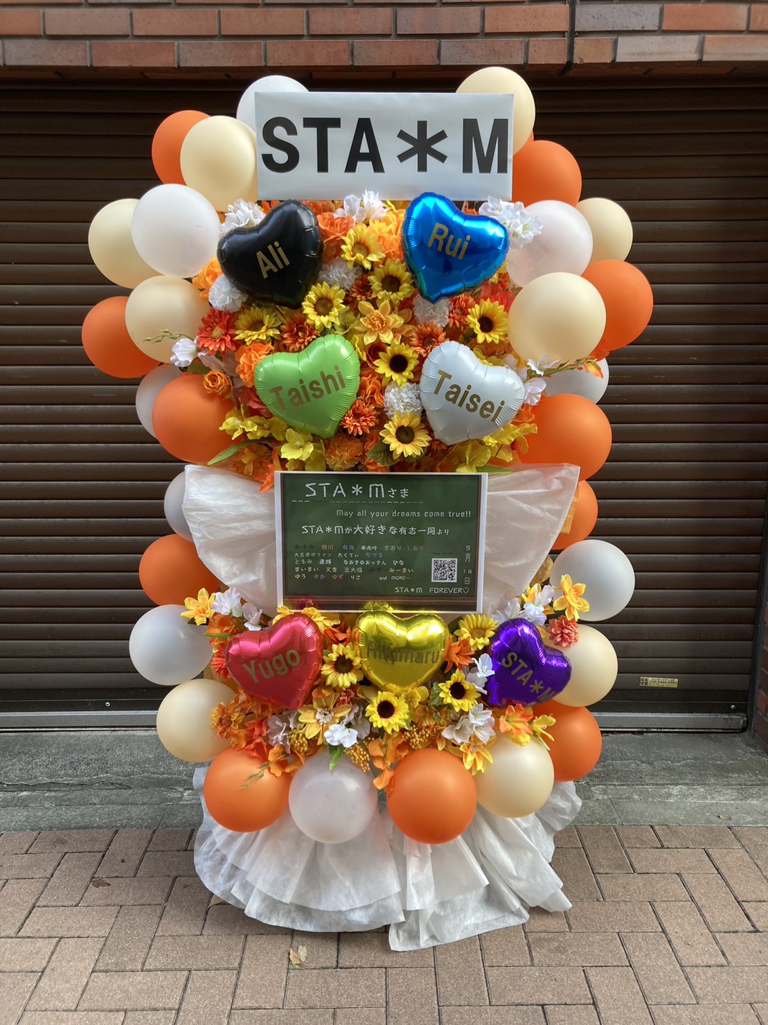STA*Mのラストライブへ贈られた、オレンジと黄色の温かく華やかなフラスタ。たくさんのバルーンとひまわりの花が、メンバーへの深い愛と感謝を伝えます。