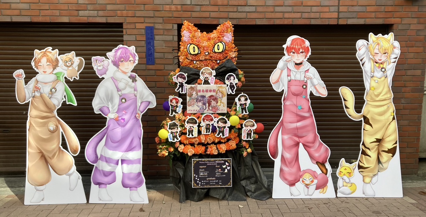 浦島坂田幽霊船ハロウィンライブに合わせた、オレンジとパステルカラーが可愛いフラスタ。猫モチーフのキャラクターパネルと生花で賑やかな雰囲気を演出!
