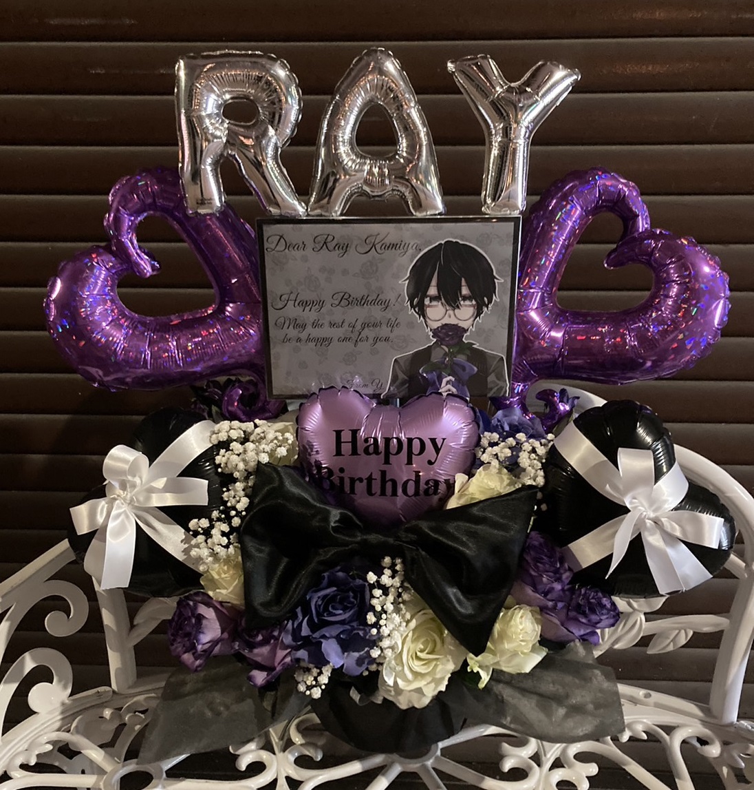 神谷玲様の生誕祭フラスタ。紫と黒を基調に、キャラクターパネルとバルーンを豪華に飾り付け、クールで華やかなお祝いを演出しました。