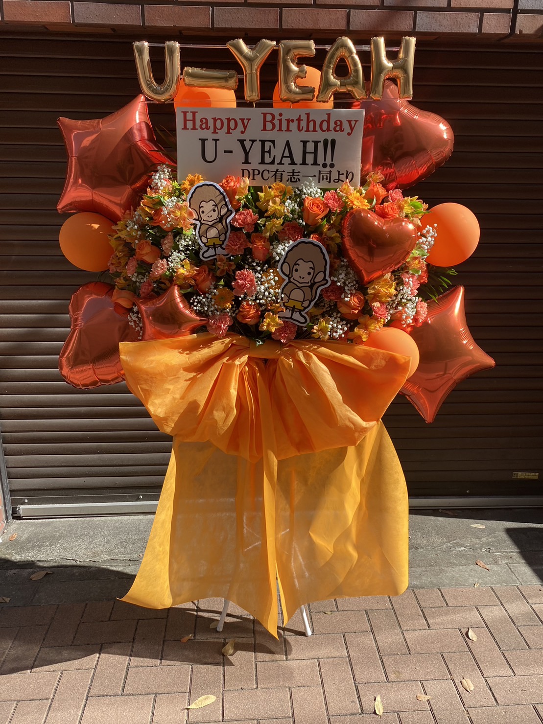 DA PUMP U-YEAHさんのお誕生日を祝うフラスタ。オレンジ系の生花とバルーンが太陽のように明るく華やかな印象です。