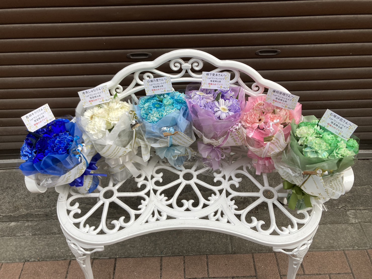 彗星♩dropTune゚ワンマンライブへ贈られた、メンバーカラーが目を引く生花の花束。爽やかで華やかな雰囲気が魅力的です。