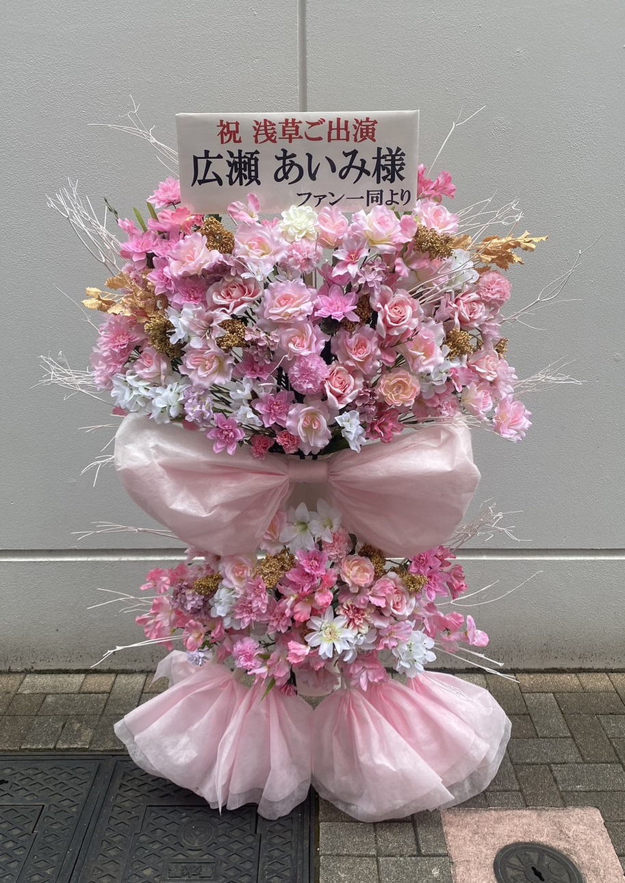 浅草ロック座ご出演のお祝いフラスタ。優しいピンクと白のお花が、可憐で華やかな雰囲気を演出しています。