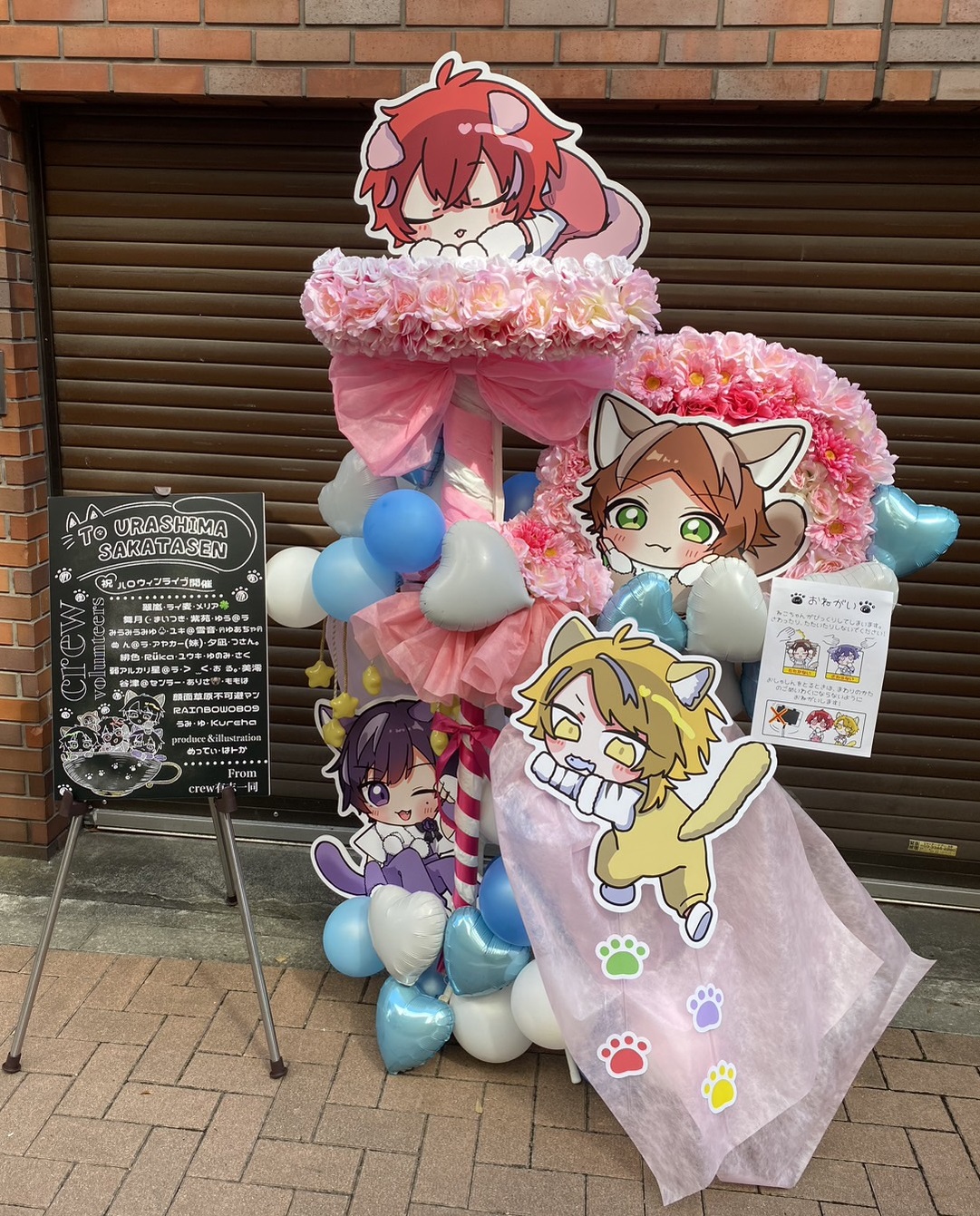 ピンクと水色を基調とした、可愛らしいバルーンと造花が華やか。猫耳キャラクターパネルがキュートなフラスタです。