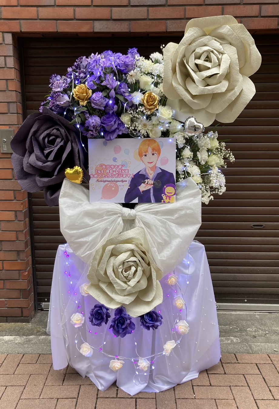 古川慎さんの1st Re-Liveを祝うフラスタ。紫と白を基調に、黒の大きなバラとLED装飾が上品で幻想的な雰囲気を醸し出しています。