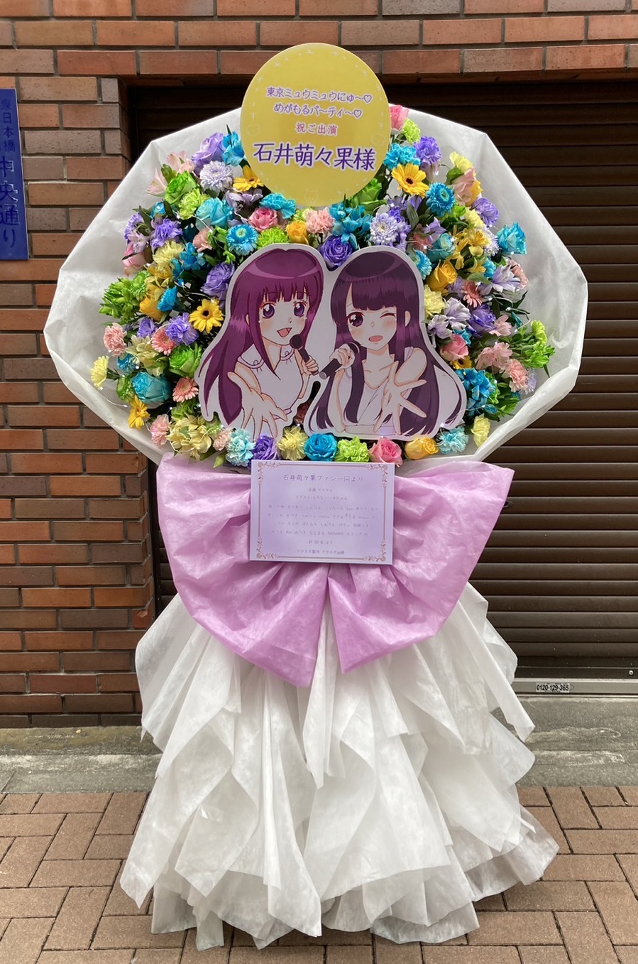 石井萌々果様へのフラスタは、パステルカラーの生花と可愛いキャラクターパネルが特徴。上品な紫のリボンが全体をまとめ、会場を華やかに彩りました。