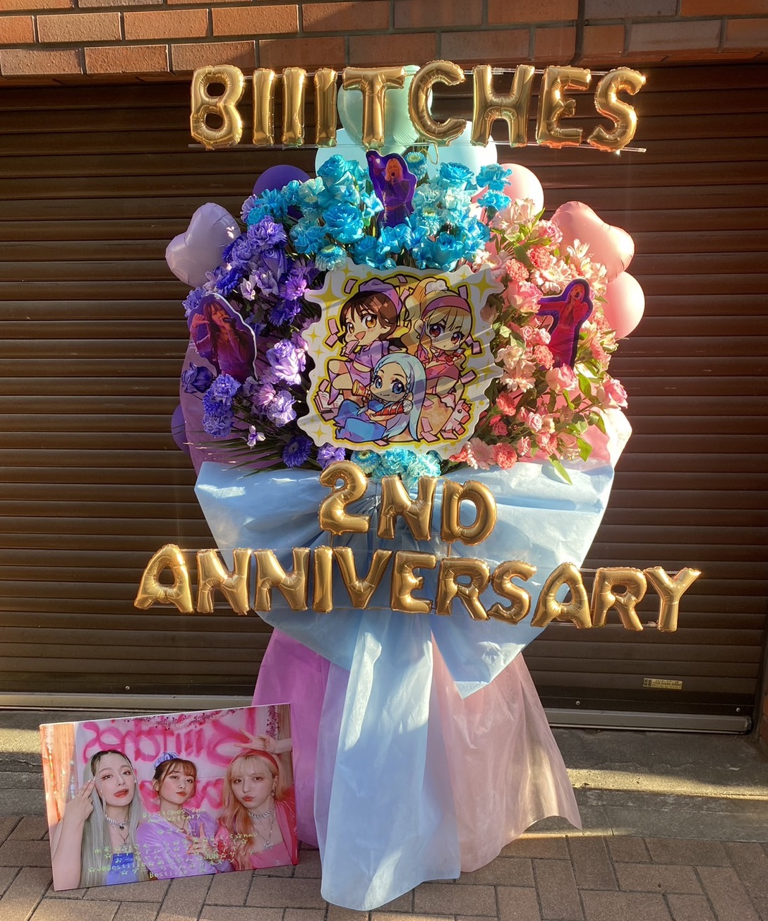 Biiitches 1stワンマンライブのお祝いフラスタ。水色、紫、ピンクのパステルカラーでまとめられ、華やかで可愛らしい雰囲気。メンバーのイラストパネルが目を引きます。
