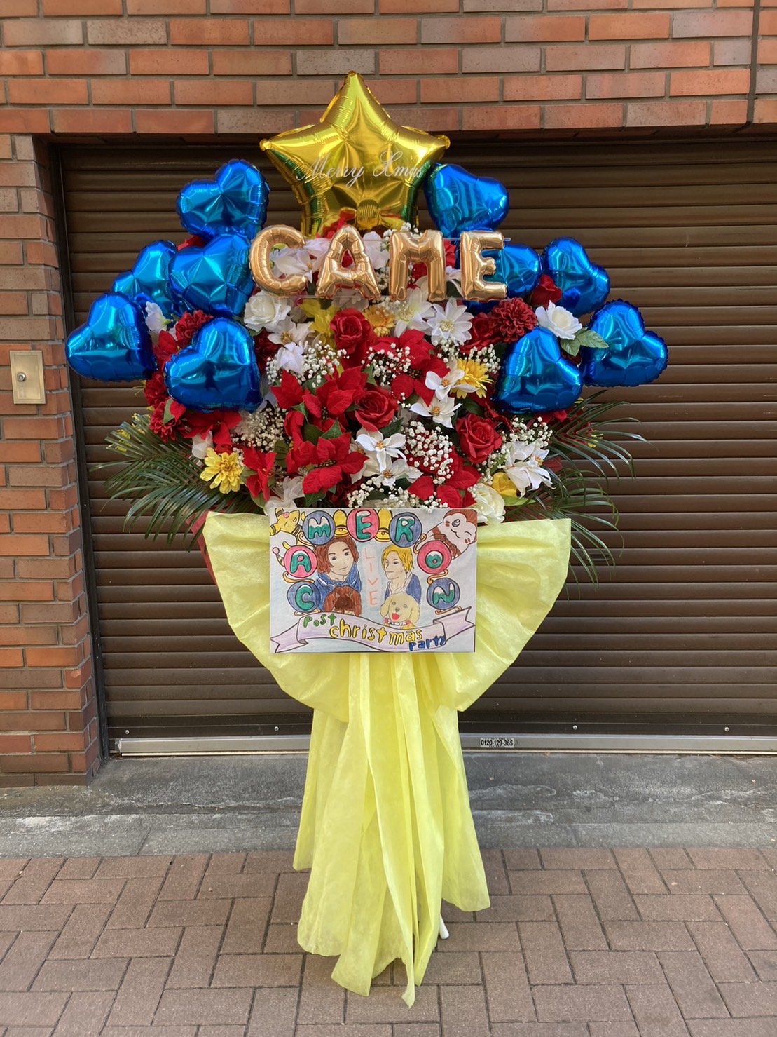 「Came Channel クリスマスワンマンライブ」へのお祝いフラスタ。赤、白の華やかな生花に青いバルーンと黄色の装飾がクリスマスムードを盛り上げます。