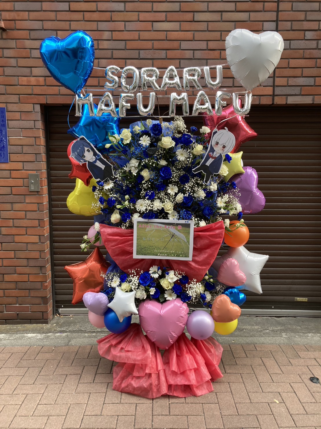青と白の生花が爽やかなフラスタ。ピンクのハートバルーンとキャラクターパネルが華やかさを添え、可愛らしい雰囲気を演出しています。