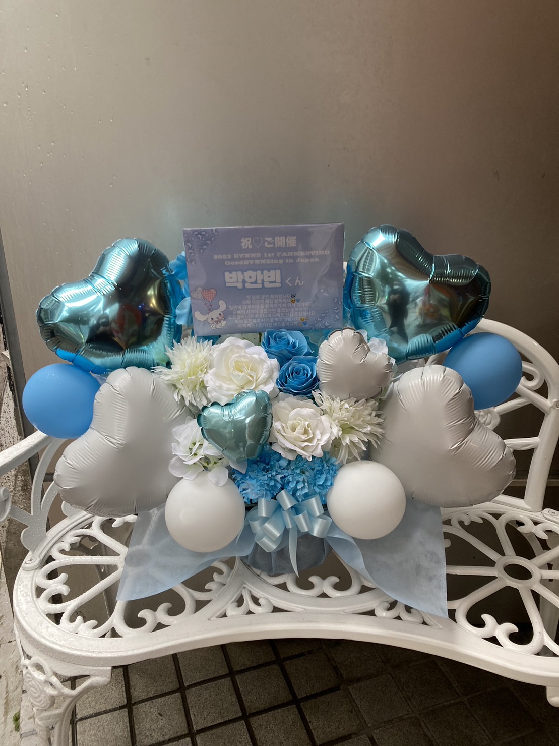 青と白を基調とした爽やかなフラスタ。ハート型バルーンとメッセージパネルが可愛らしい雰囲気を演出しています。