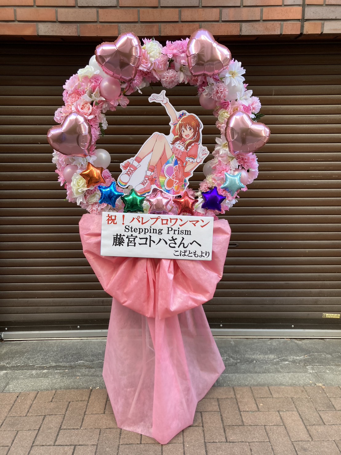 ピンクと白のパステルカラーが可愛らしい、藤宮コトハさんへのお祝いフラスタ。ハートバルーンも華やかです。