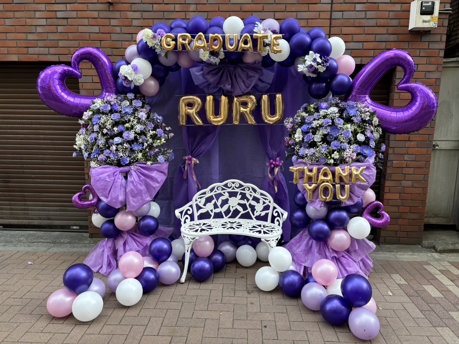 胡桃るる卒業公演をお祝いする、紫とピンクを基調とした華やかなフラスタ。バルーンと生花の組み合わせが豪華で、感謝の気持ちを伝えます。
