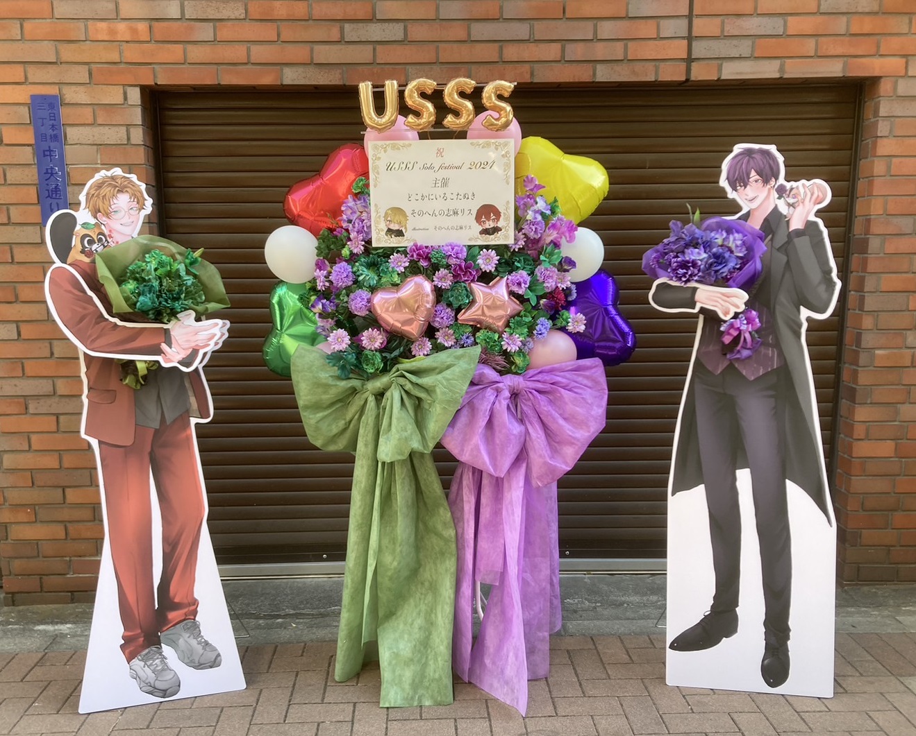 紫と緑の生花が鮮やかなフラスタ。ピンクのバルーンとキャラパネルがイベントを華やかに彩ります。