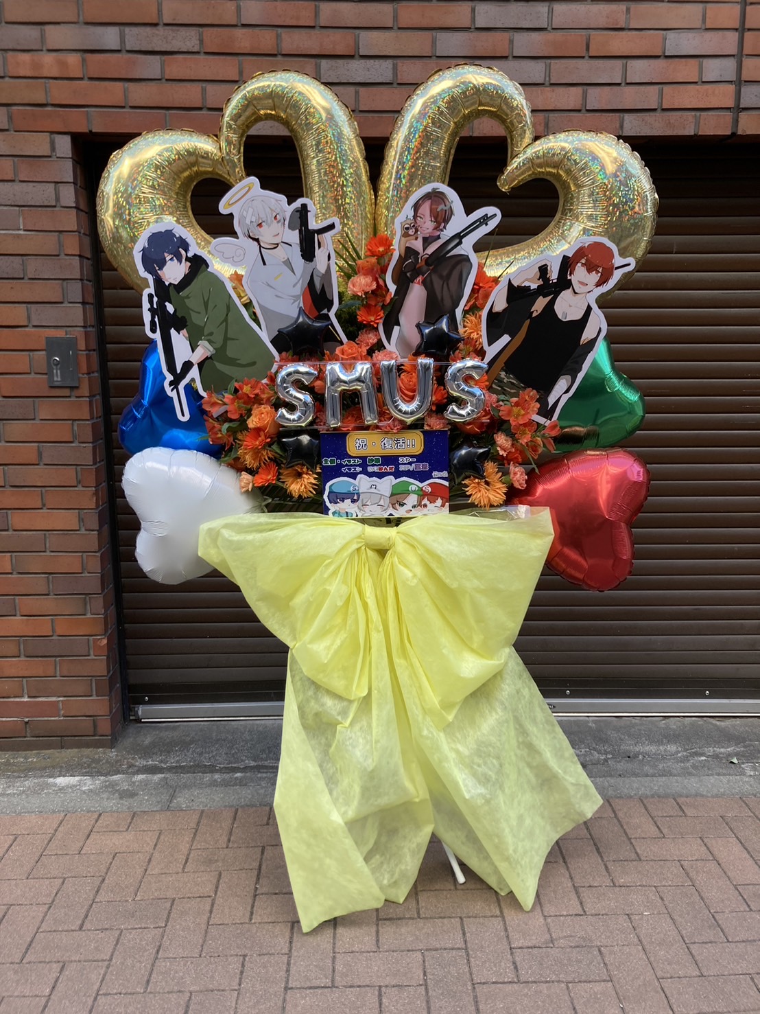 「復活のそらまふうらさか!」イベントへ贈られた、黄色とカラフルなバルーンが目を引くポップなフラスタ。キャラクターパネルが華やかさを添えています。