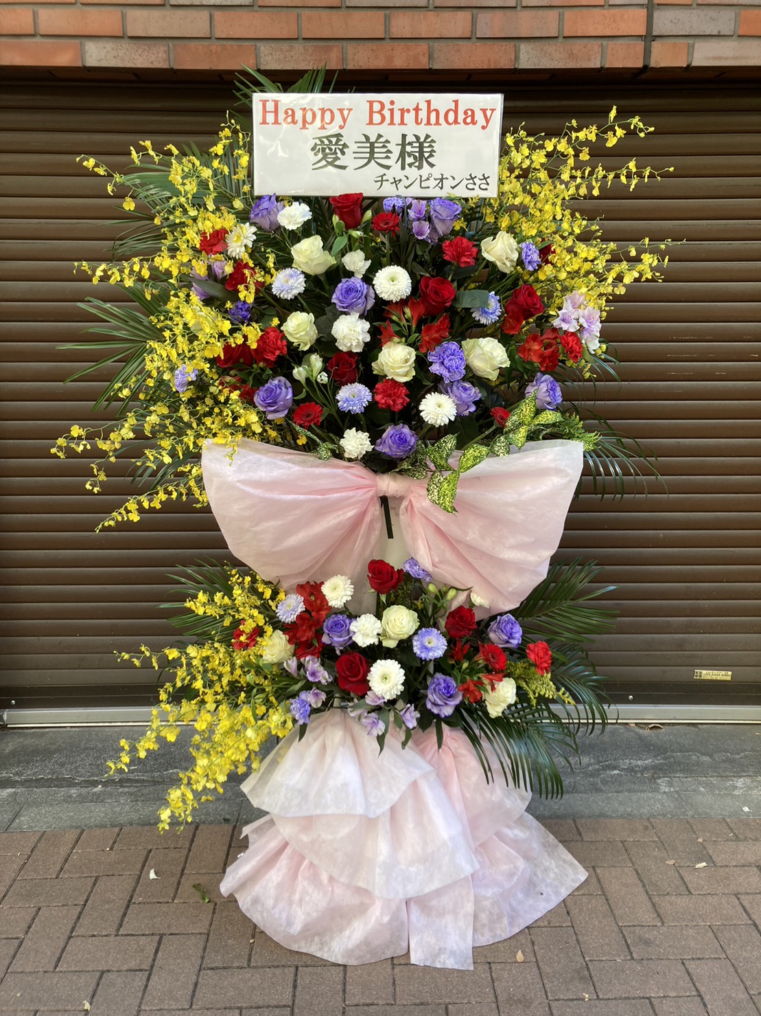 愛美様の誕生日イベントを彩る華やかなフラスタ。赤、黄、紫の鮮やかな花々と優しいピンクのリボンで、お祝いムード満点です。