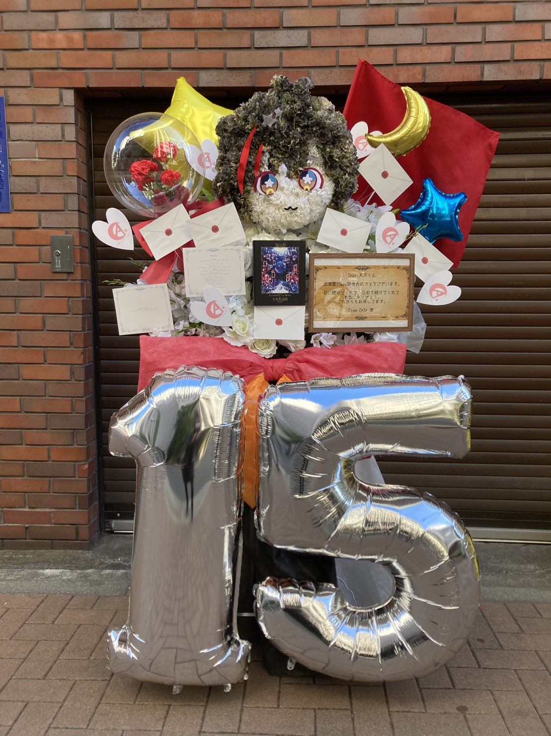 天月さんの武道館ライブをお祝い!赤と白を基調に、キュートなキャラオブジェと15バルーンが華やか。温かいメッセージも魅力的なフラスタ。