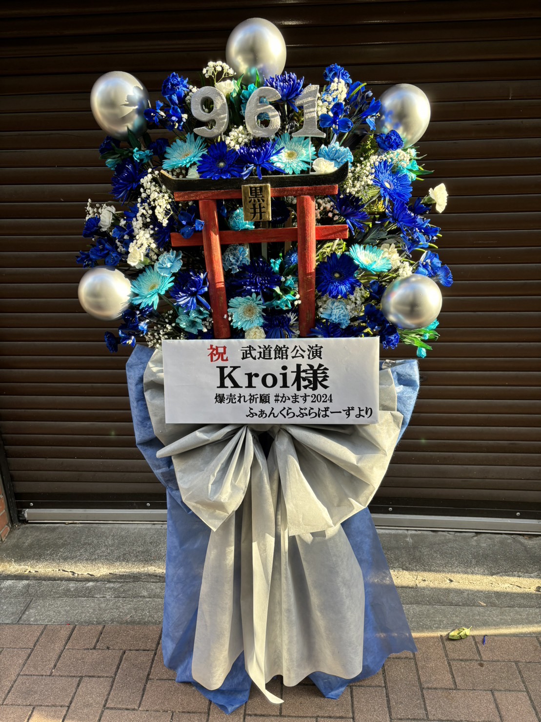 青と白の花々が鮮やかなフラスタ。赤い鳥居がアクセントになり、武道館公演の成功を祝う荘厳な雰囲気です。