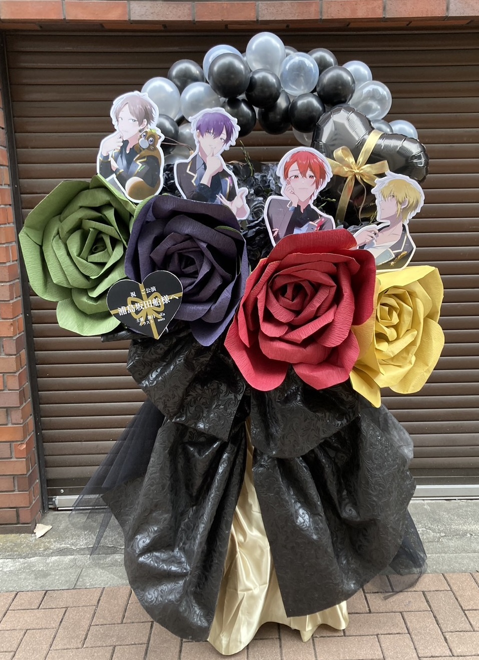 USSSソロフェスをお祝いするゴージャスなフラスタ。黒を基調に、赤・紫・緑・黄の大きな造花とメンバーパネルで、シックながらも華やかな祝祭感を演出。バルーンも彩りを添えています。
