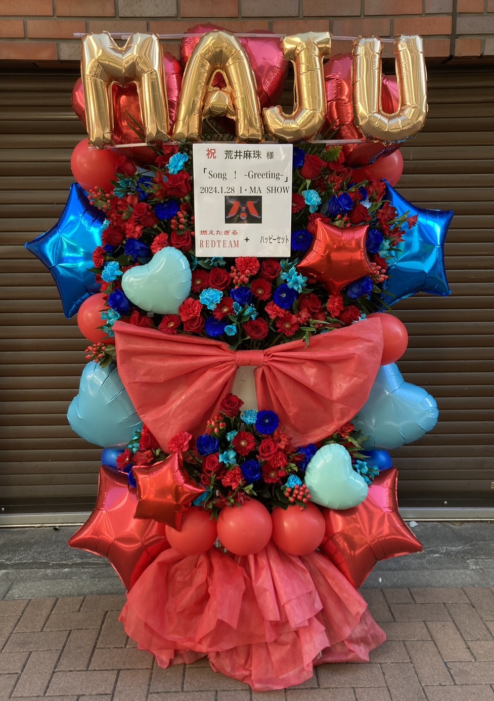 荒井麻珠様の『Song!~Greeting~』を祝うフラスタ。赤と青を基調に、生花とバルーンで情熱的かつ華やかに彩られています。