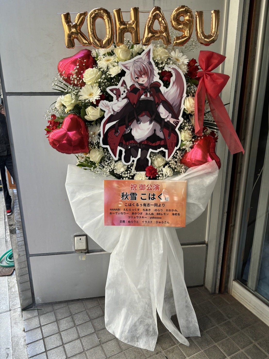 白と赤を基調とした華やかなフラワースタンド。金色の名前バルーンと可愛いキャラクターパネルが目を引きます。