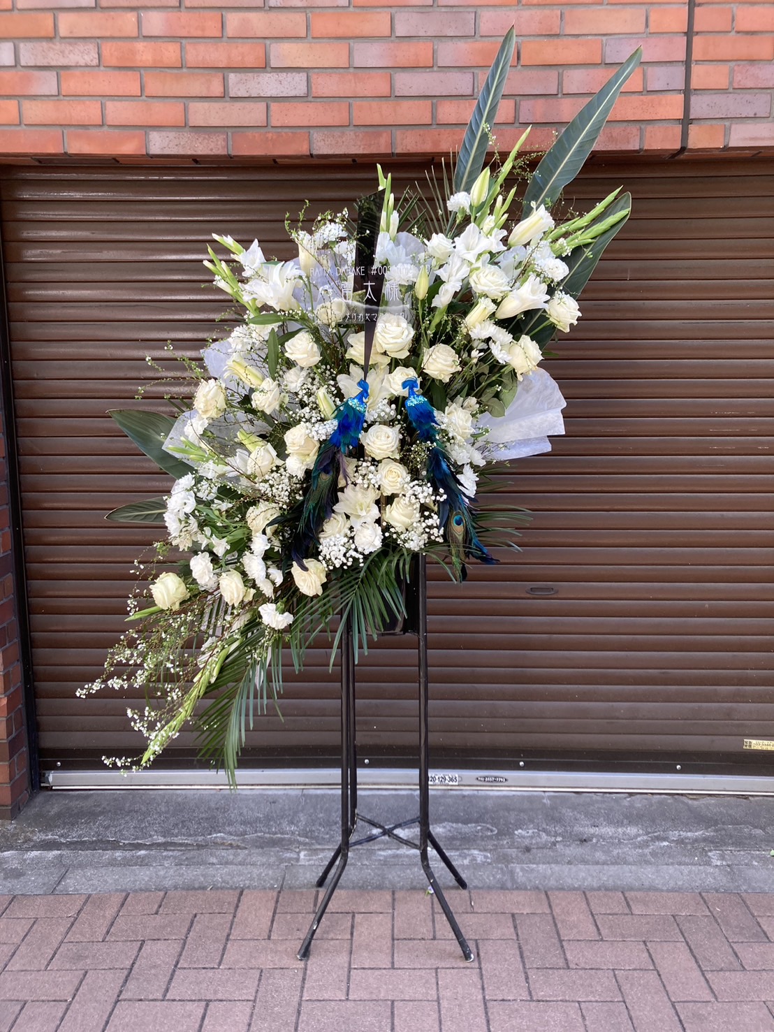 「PAITA DARAKE #003 times 10」を祝う、白と緑を基調としたフラスタ。青い孔雀の装飾が上品な華やかさを添えています。会場を彩る爽やかなデザインです。